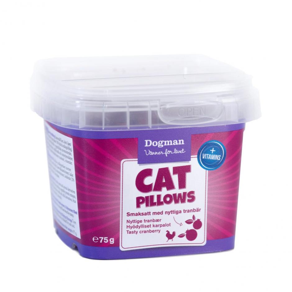 Dogman Kattepuder, kattegodbidder til katte. Små sarte puder med sprød overflade og smag af lækker kylling. Kattegodbidderne er beriget med vitamin A, D3 og E samt tranebær, som fremmer urinvejssundheden hos steriliserede katte. Uden tilsat sukker. Gives som slik sammen med en afbalanceret kost.