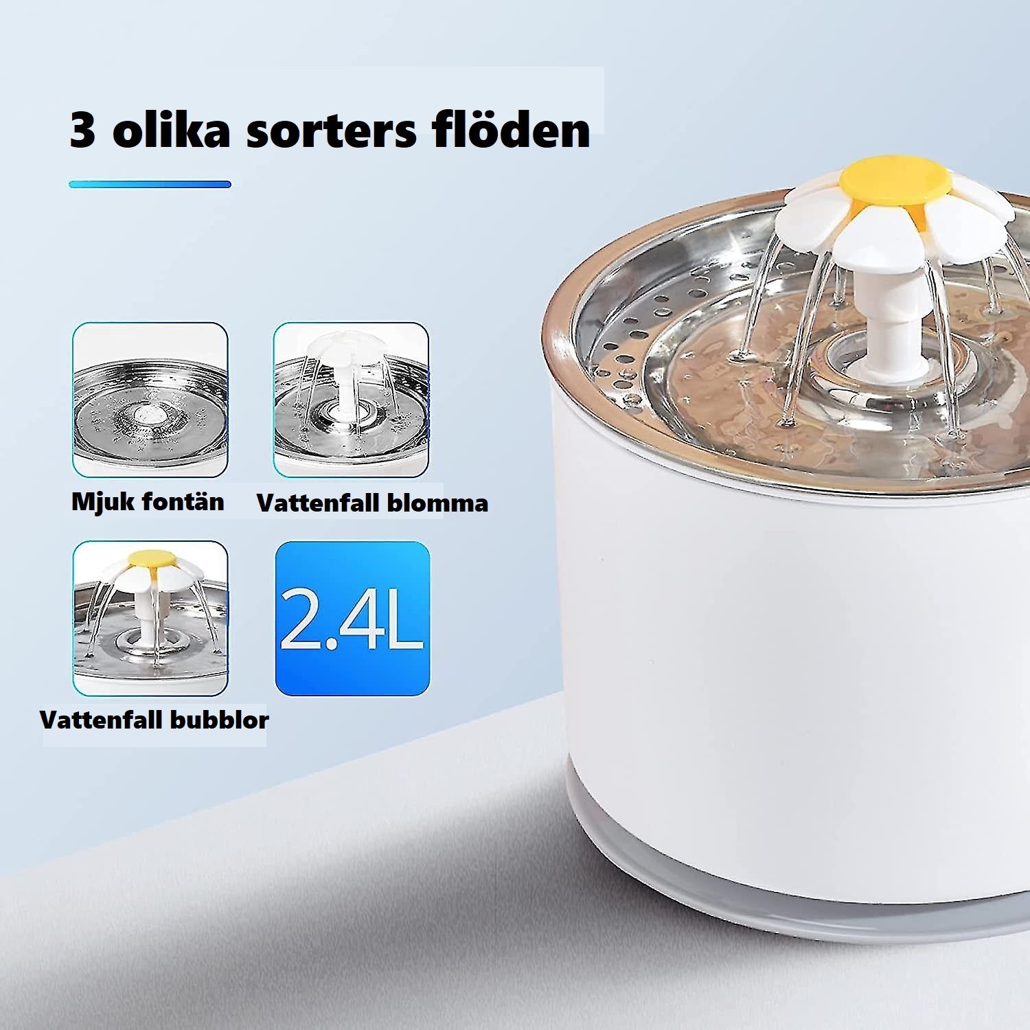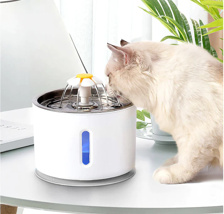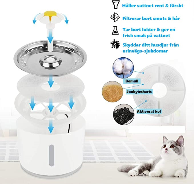 Vores LED-fontæne til katte har en stor kapacitet på 2,4 liter , udstyret med et kul- og bomuldsfilter, der filtrerer dårlige lugte, snavs og andre partikler, der kan være skadelige for din kat. Dette mindsker risikoen for, at din kat får nyresten/urinsten og andre problemer.