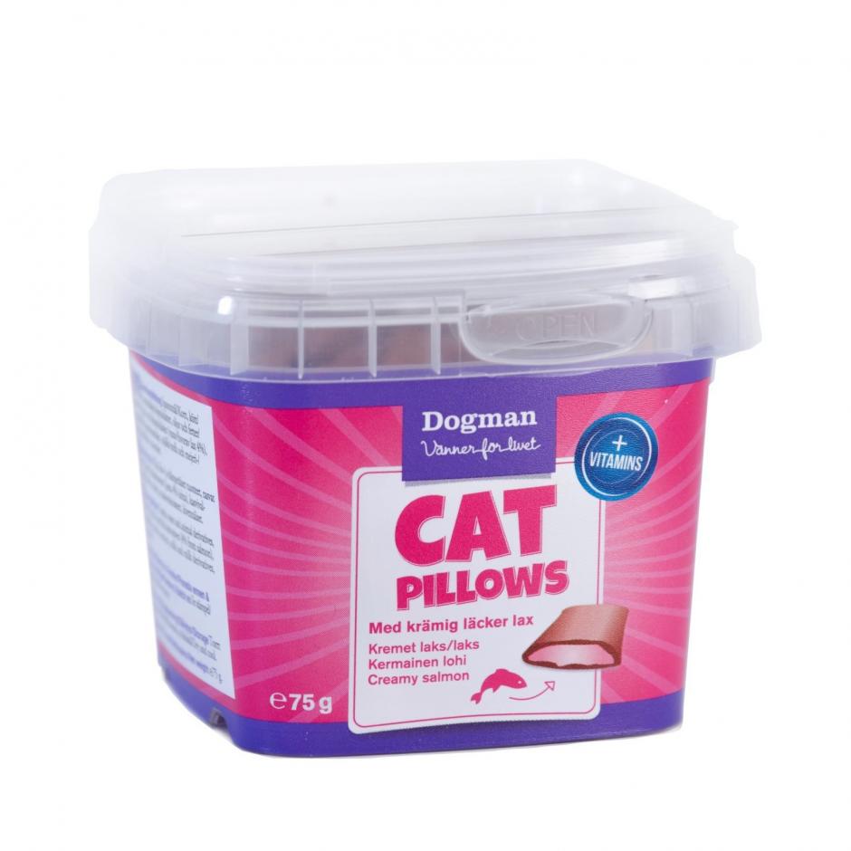 Dogman Katzenkissen, Katzenleckerlis für Katzen. Kleine, zarte Kissen mit knuspriger Oberfläche und cremigem Inhalt aus köstlichem Lachs. Wird schnell zum Lieblingsleckerli der Katze! Die Katzensnacks sind mit den Vitaminen A, D3 und E angereichert. Ganz ohne Zuckerzusatz. Als Süßigkeit zu einer ausgewogenen Ernährung gegeben.