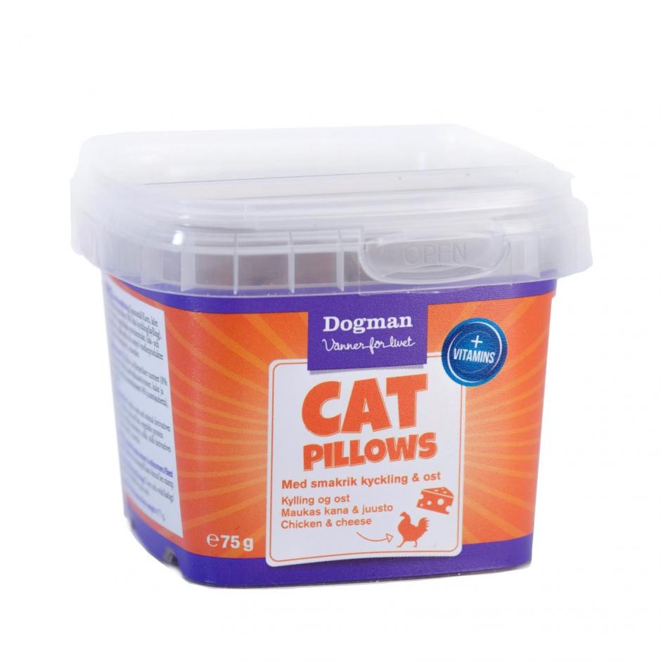 Dogman Katzenkissen, Katzenleckerlis für Katzen. Kleine, zarte Kissen mit knuspriger Oberfläche und cremigem Inhalt aus leckerem Hähnchen und Käse. Wird schnell zum Lieblingsleckerli der Katze! Die Katzensnacks sind mit den Vitaminen A, D3 und E angereichert. Ganz ohne Zuckerzusatz. Als Süßigkeit zu einer ausgewogenen Ernährung gegeben.