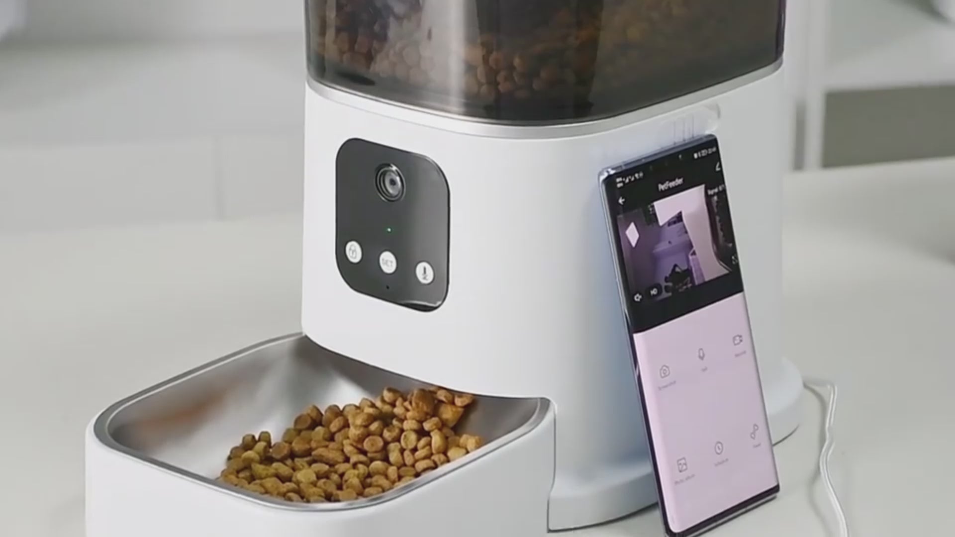 Syöttölaite on varustettu teräväpiirtokameralla, mikrofonilla, kaiuttimella ja virtaliitännällä. Siinä on myös akkutuki, 3 D-paristoa (ei sisälly), jotta kissasi saa ruokaa, vaikka virta katkeaa.