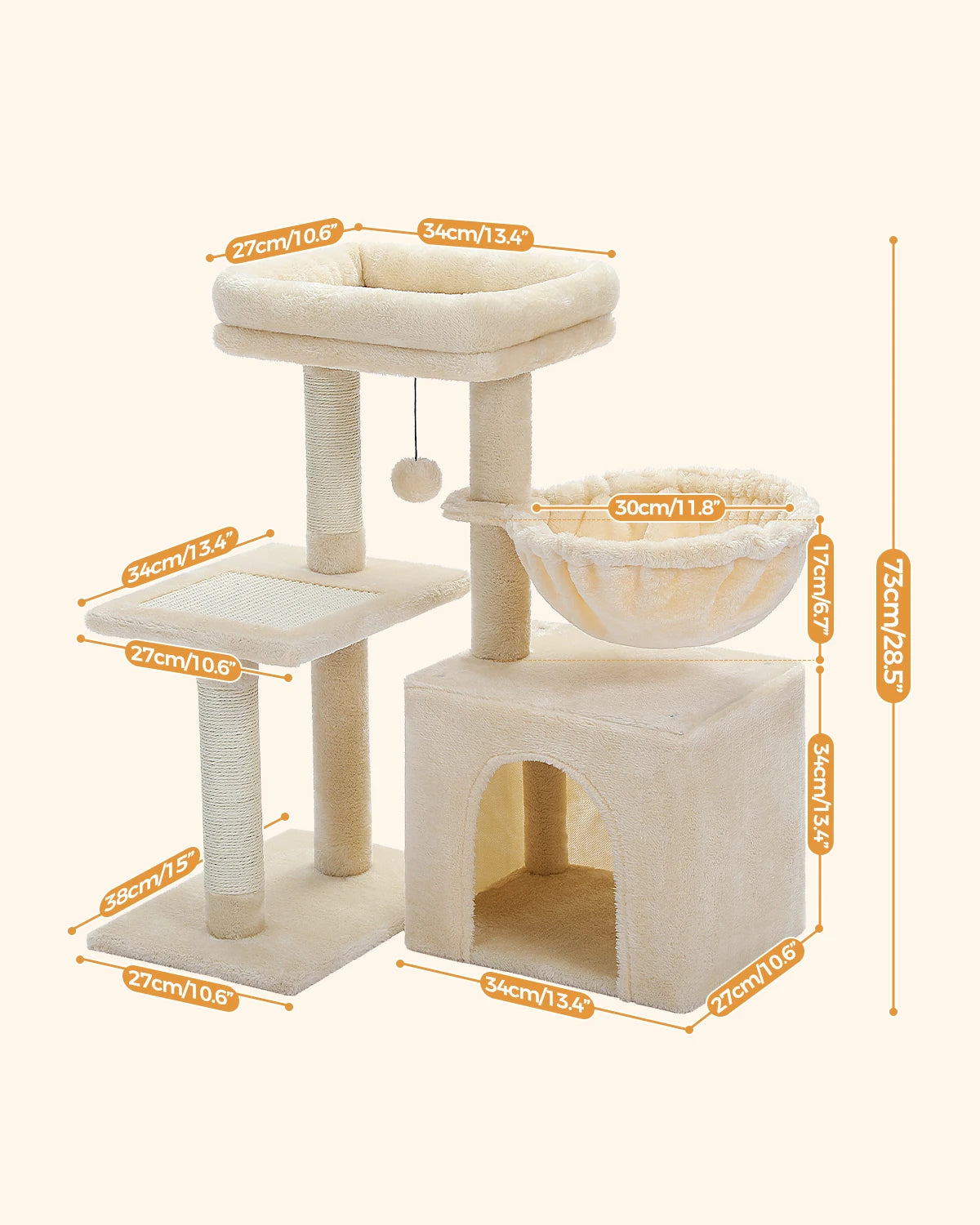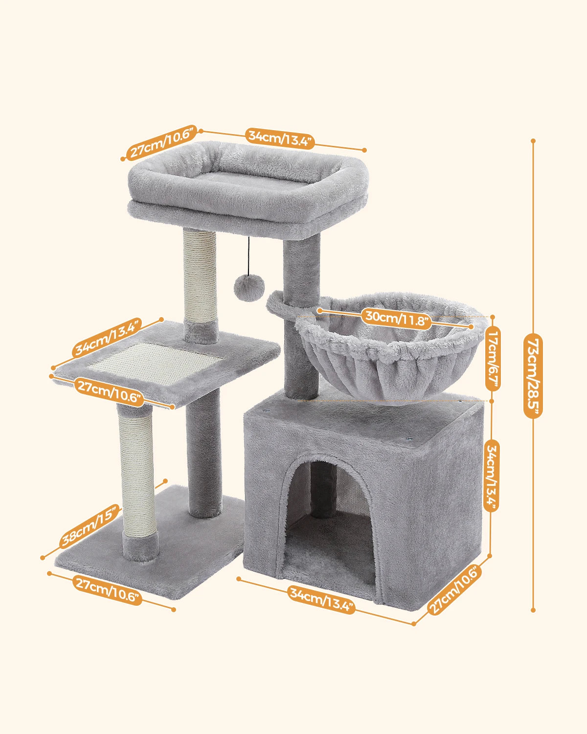 Yläosassa on suuri, pehmeä sänky, jossa mukavat reunat ja irrotettava tyyny helpottaa puhdistamista. Raaputustolppassa on myös sisäänrakennettu raapimislauta ja irrotettava kansi, mikä tekee siitä sekä käytännöllisen että toimivan.