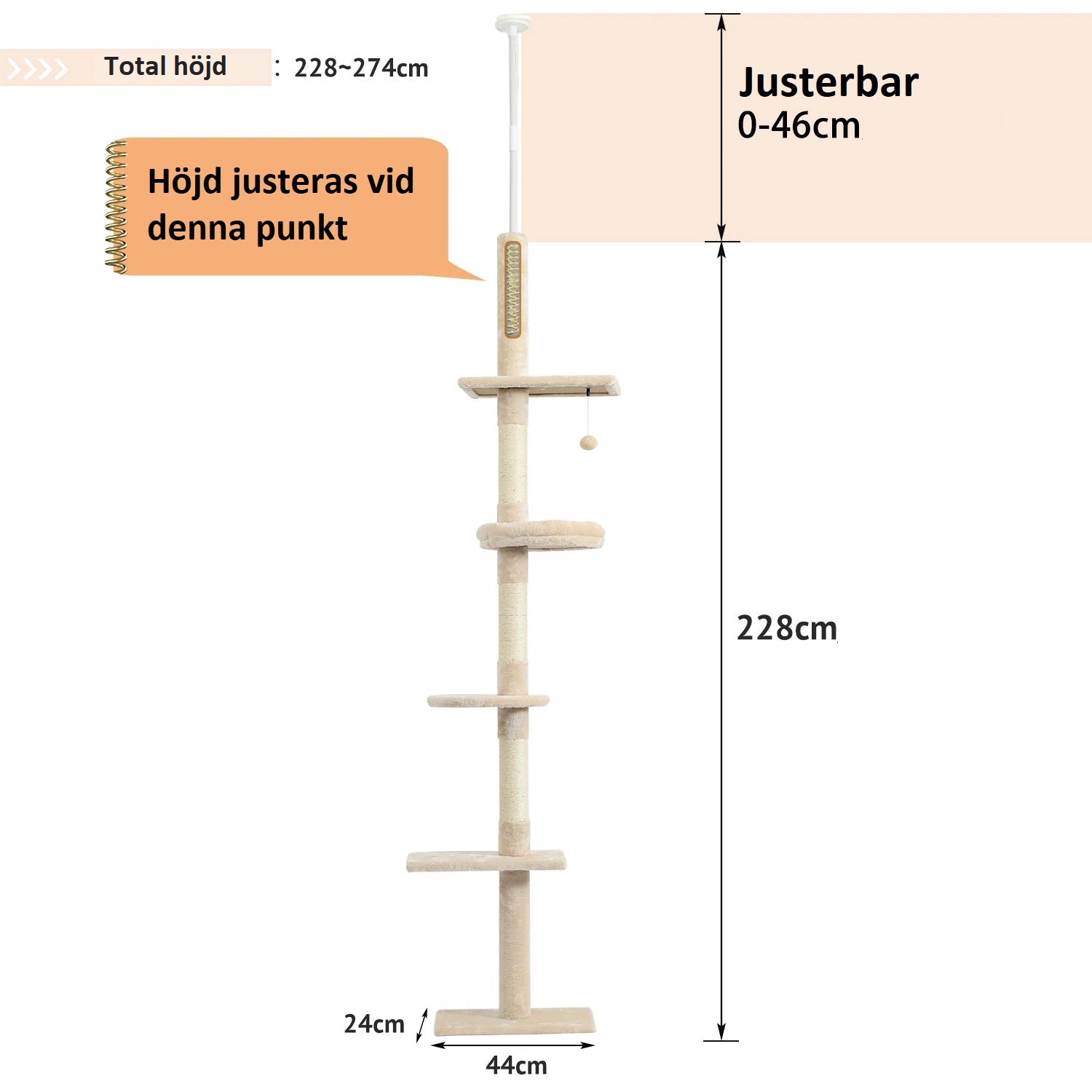 Detta justerbara golv-till-tak klösträd erbjuder katter en fantastisk klätterupplevelse utan att ta upp mycket plats i hemmet. Med en höjd på 228-274 cm ger det både höga och låga nivåer för din katt att utforska.