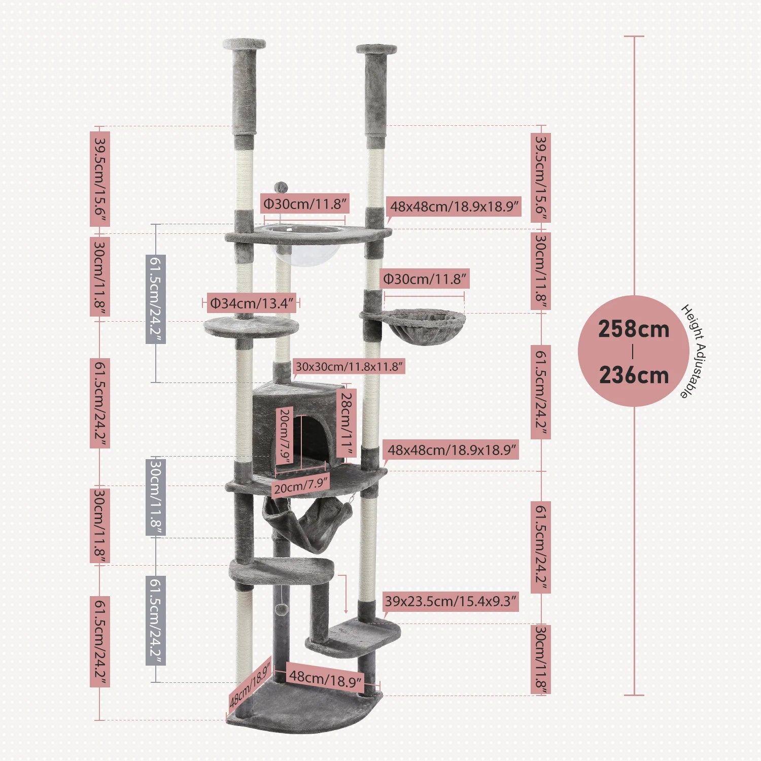 Ett justerbart och rymligt klösträd som sträcker sig från 236 cm till 258 cm, perfekt för aktiva inomhuskatter och kattungar. Detta klösträd med fem nivåer erbjuder gott om utrymme för klättring, lek och vila.