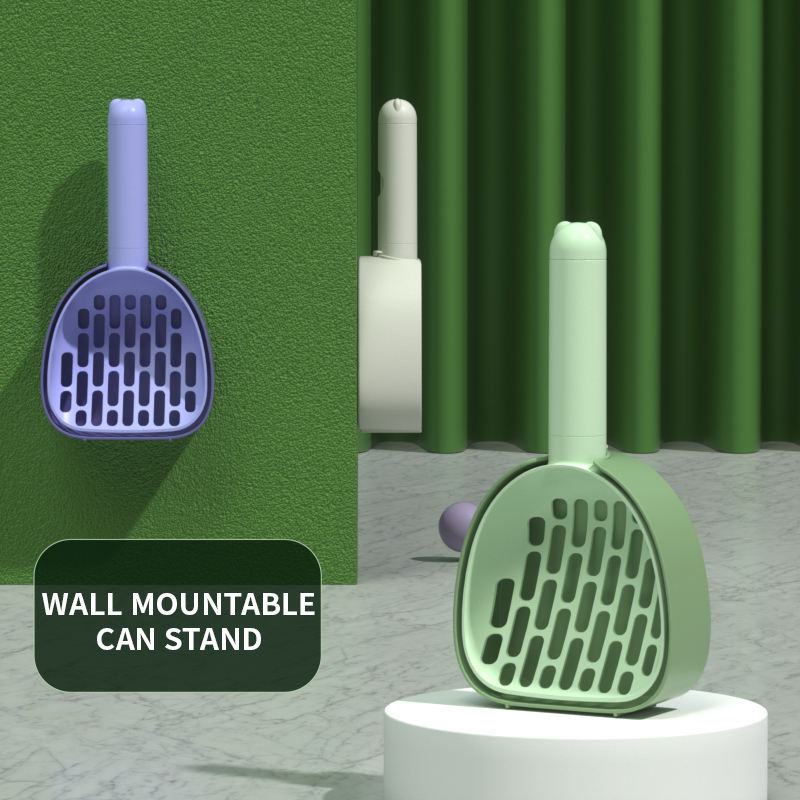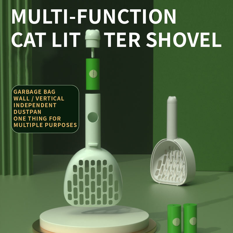 Smart multifunktionell kattsandsskopa för enkel rengöring och hantering samt med inbyggd avdelning för förvaring av plastpåsar.