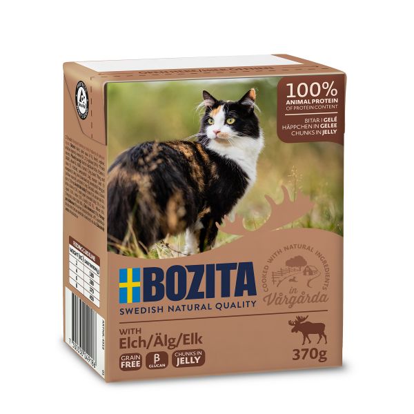 Blötmat för vuxna katter. Bitar i gelé med hög halt av svenskt kött (93%) och smak av älg. Låg fetthalt, hög smältbarhet och smaklighet. Fritt från soja, spannmål och konserveringsmedel. Inget tillsatt socker. ß-glukan stärker immunsystemet.