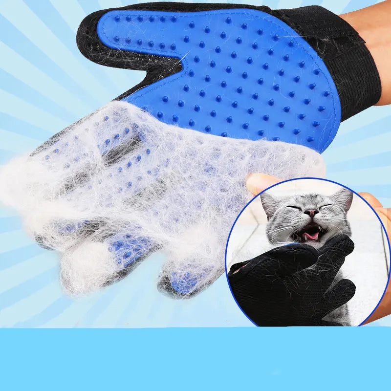 Den ena sidan på trimhandsken är mjuk och har piggar av gummi som är utformade för att ge hunden/katten en skonsam massage, vilket kan öka blodcirkulationen och ge ditt pälsdjur en avkopplande stund. Handsken kan användas när du badar ditt husdjur för att skumma upp schampot för att rengöra pälsen ordentligt.